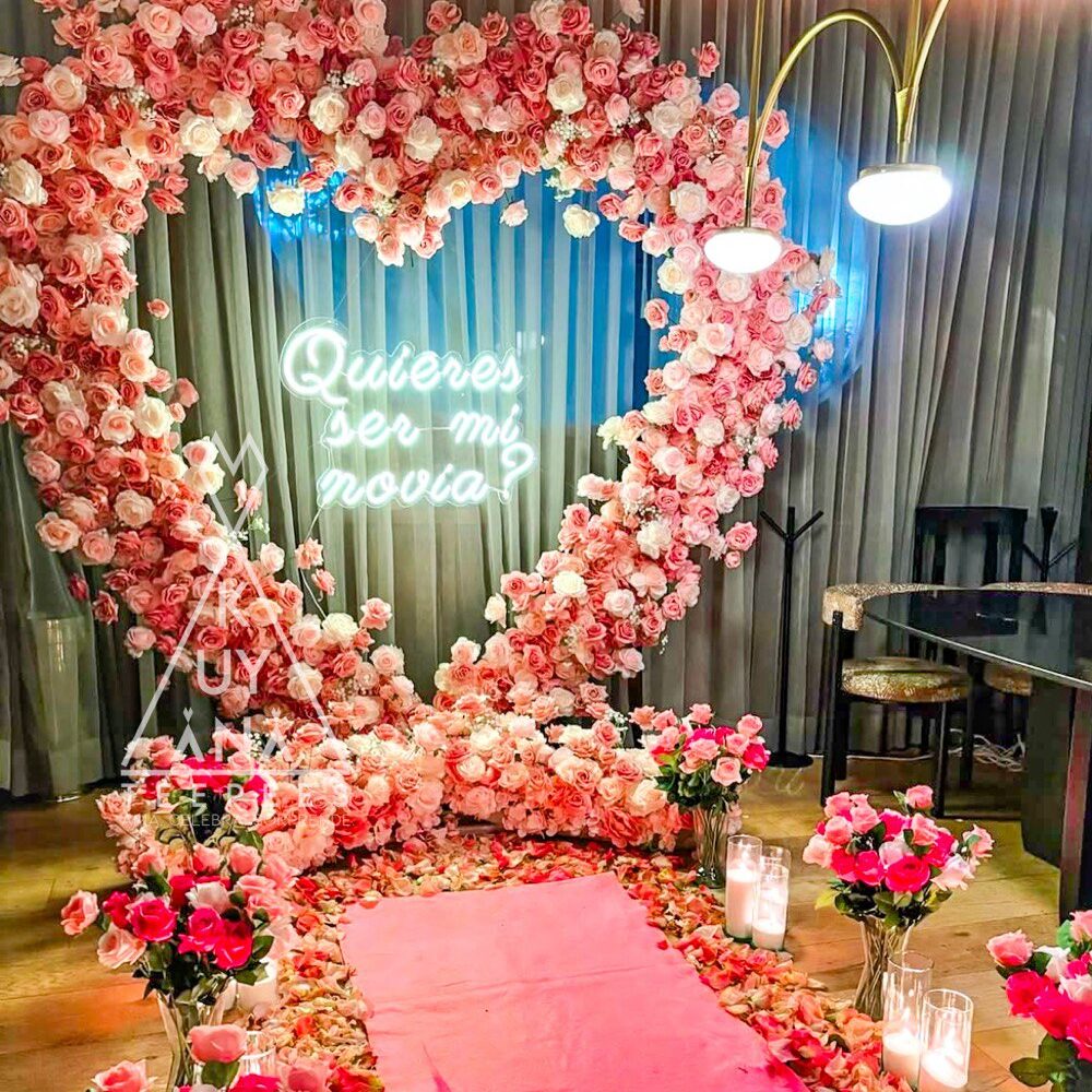 Estructura corazón de metal cenefa floral rosada 600cm para todo el contorno del corazón letrero luz neón decoración abundante en pétalos de rosa rosados alfombra rosada