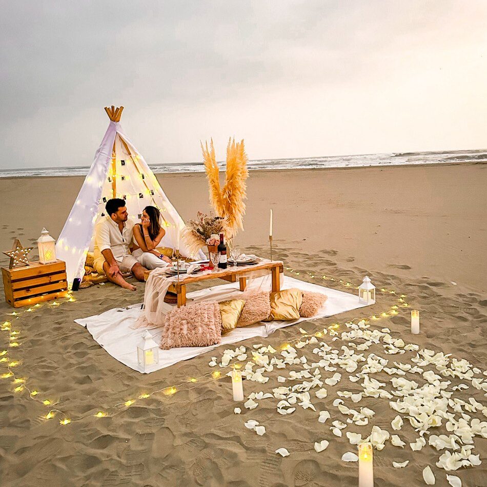 Mesa picnic decorada (Incluye: 1 mesa tipo pallet + 5 cojines +1 mantel tipo camino + adornos para mesa +1 tela para piso + guirnalda de luces alrededor de picnic)