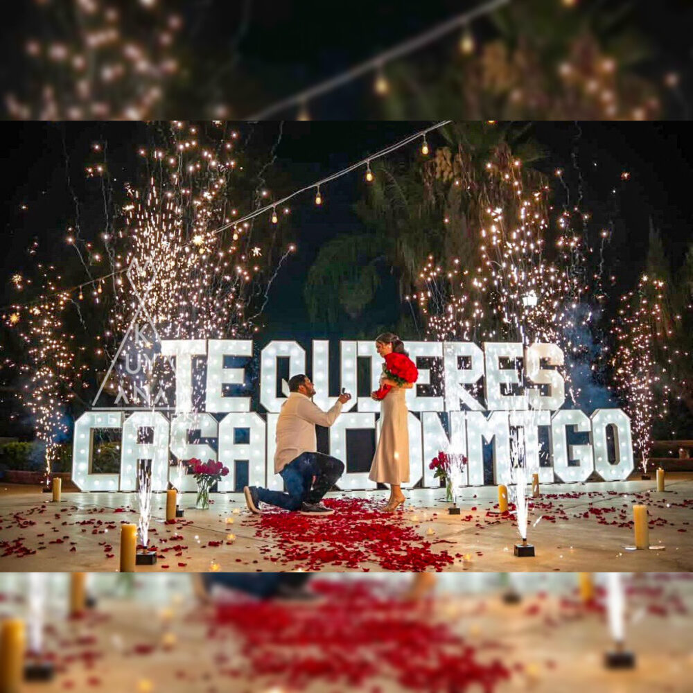 20 Letras luminosas grandes “TE QUIERES CASAR CONMIGO” alfombra roja decoración abundante pétalos de rosa